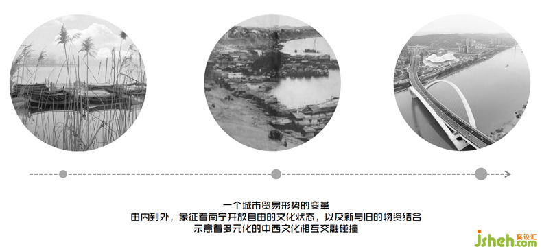 清代诗人黄体元笔下“大船尾接小船头,北调南腔语不休。照水夜来灯万点,满江红水乱星浮”的邕江亭子渡。南宁水上丝绸之路,贯穿古今,作为当代的时空之窗——穿行:传形。将水陆码头的韵律之美繁华重启,借现代之窗传递未来之梦。