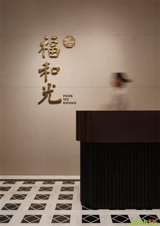 大堂区域,接待台背景墙使用精致的店名”福和光”吸引客人目光,此区使用黑白鲜明对比的拼花地板强调到客的尊贵性,餐厅设计大面积的线雕天花从大堂一直延伸至散客区,壁面也刻意留拼缝,一路走到定点座位上,皆可感受餐厅的细致用心。