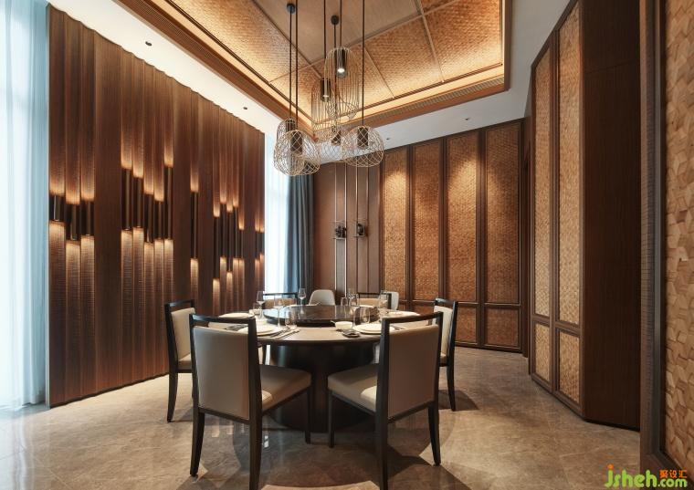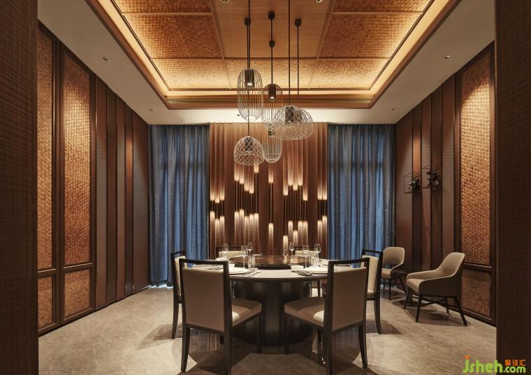 餐厅设计墙面巧妙融合了藤编与木雕技艺,配以仿藤编金属网装饰内置木雕艺术作品,既彰显了客庄铁道文化与木雕艺术的独特魅力,又凸显了客家人宴客时的精致与考究。