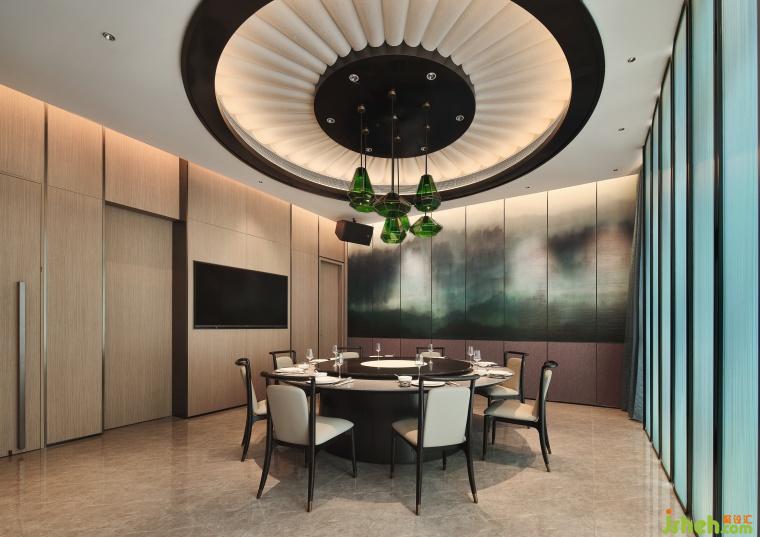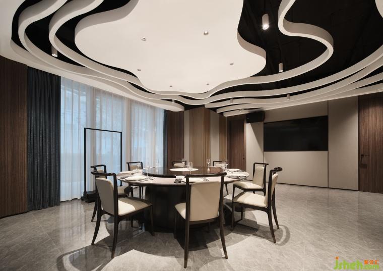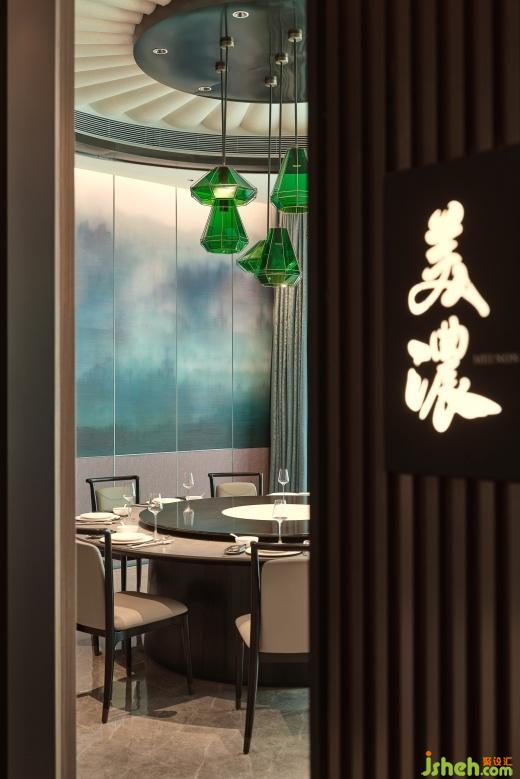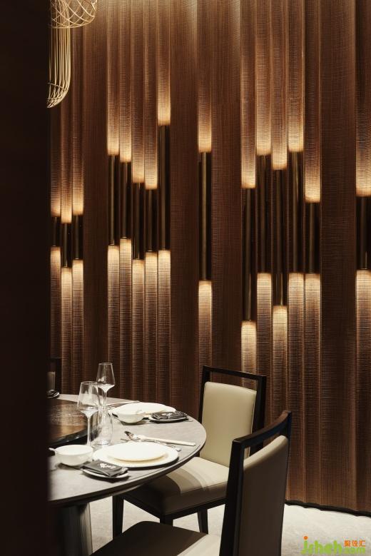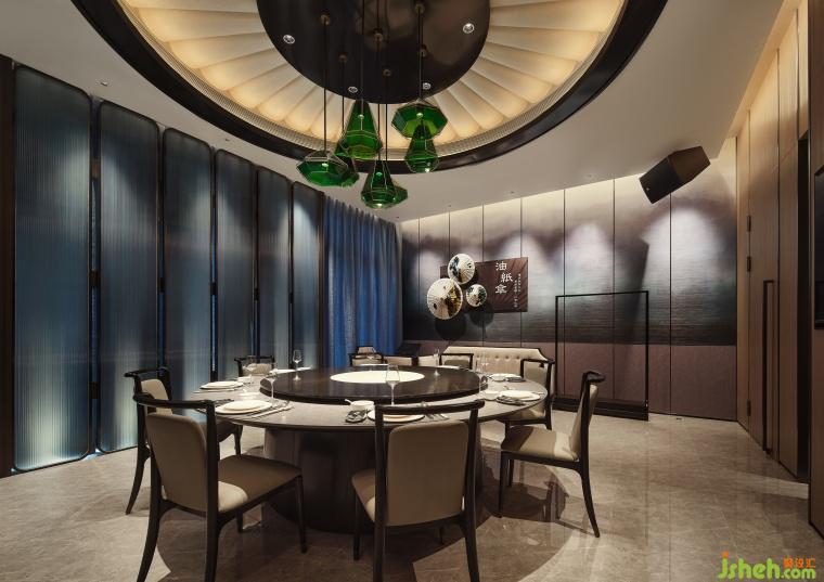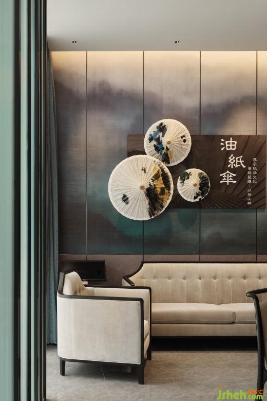 空间设计以油纸伞独特的文化内涵装饰,传递吉祥、平安和团圆的美好寓意,山林意象的壁布环绕空间,如置身于美浓宁静美好的自然风光之中。圆形天花吊顶巧妙地采用了透光材质的组合,营造出伞面撑开的视觉效果,在灯光下展现出温润轻盈的光影效果。