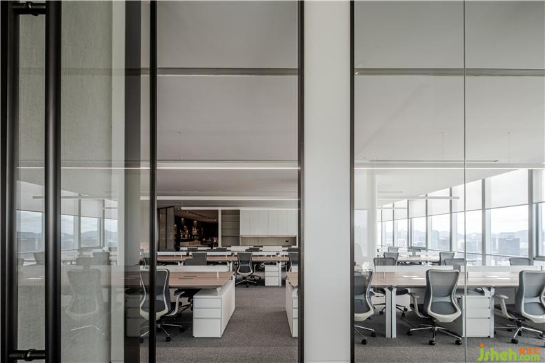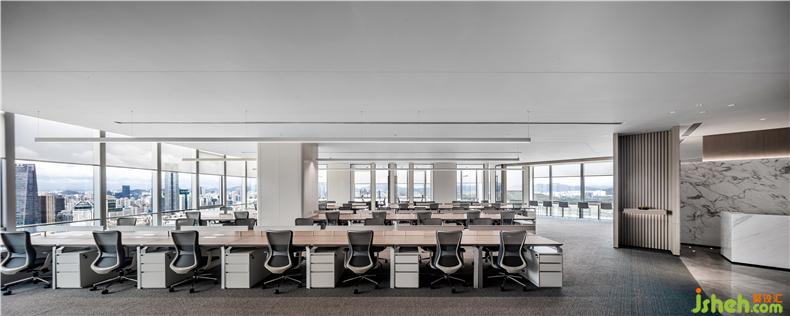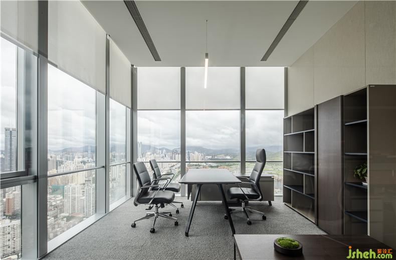 董事长办公室大面积的玻璃窗将外景引进,办公室设计深圳的日与夜变成室内一幕,俯览这座城,将城市之景尽收眼底。淡蓝色地毯从开放式办公室延伸至里,在空间里创建了一个“边界”,而地毯可以容纳人的“之间”结合在一起