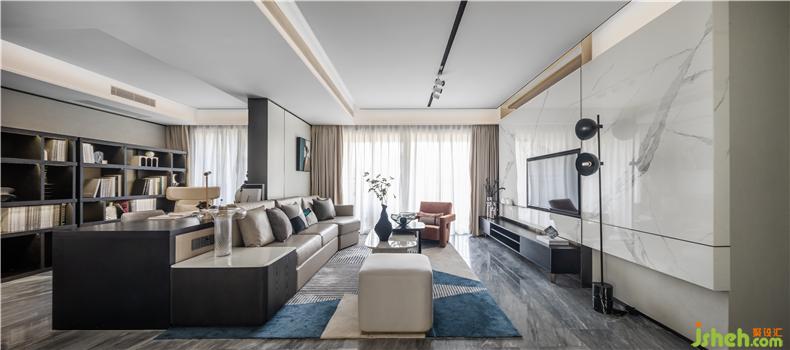 客厅运用黑色的细小线条与大面积柔和的木饰面、大理石的考究比例划分,结合开放式的书房,就像透过穿梭于香港与内地的男主人其镜头,记录下最具代表性的影像,进而通过艺术空间艺术手法的拼接,样板房设计成为独特视角,体现了两地的紧密联系与蓬勃发展的时代脉搏