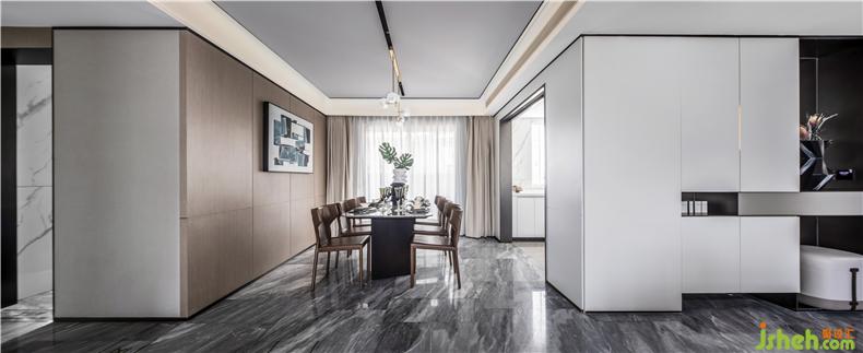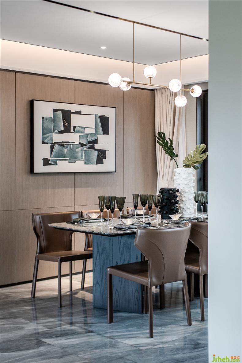 开放式式餐厅与厨房的巧妙连接,让空间变得更灵动。样板房设计大理石材质的餐桌带来的质感与皮质餐椅,形成一刚一柔的对比与碰撞