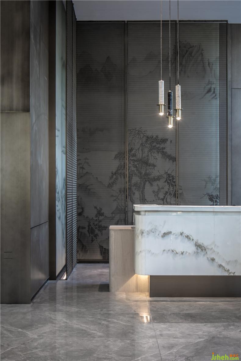 意大利冰玉石材、格陵兰灰石材沙盘台,结合夹丝玻璃隔断的屏风混搭,装修设计藉由丰富而多元的材质搭配,在这个空间营造出充满文化气息的高雅之所