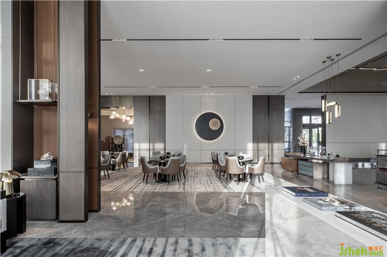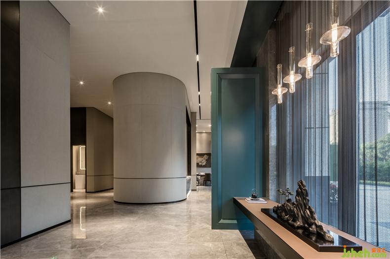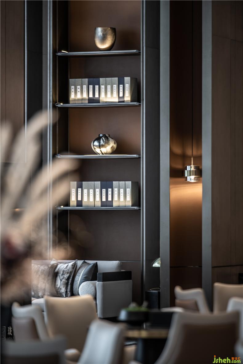金属吊灯柔和的暖光从弧形墙壁蔓延开,如圆月在水中荡漾开的水波,让这一隅更添一丝静谧。