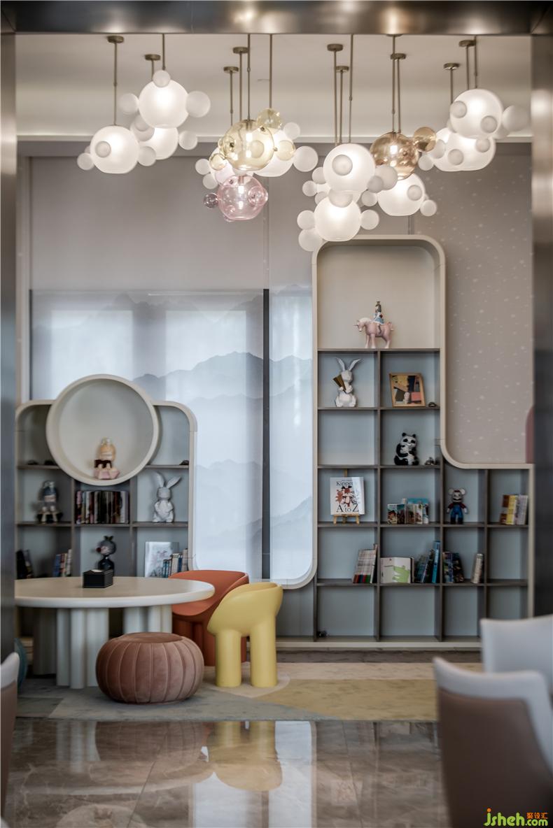 弧形是守护孩子最好的诠释,在保护孩子安全的同时,装修设计利用弧线的张力诱发想象力。悬飘在半空的球体灯,结合圆弧型的天花,成为视觉焦点,俯仰之间,仿佛陷入蹁跹云上仙境的空间感受