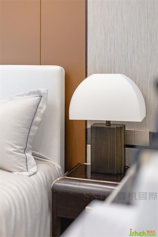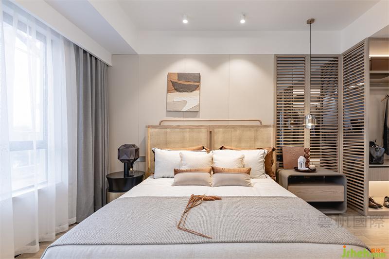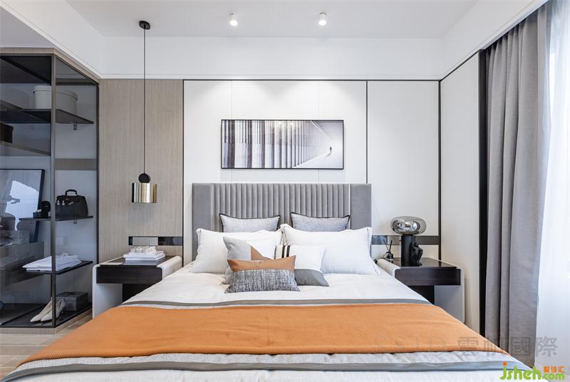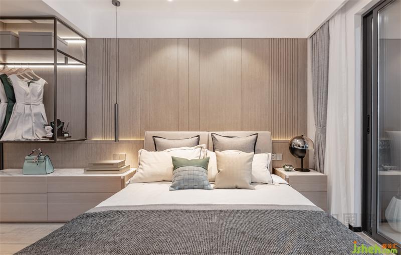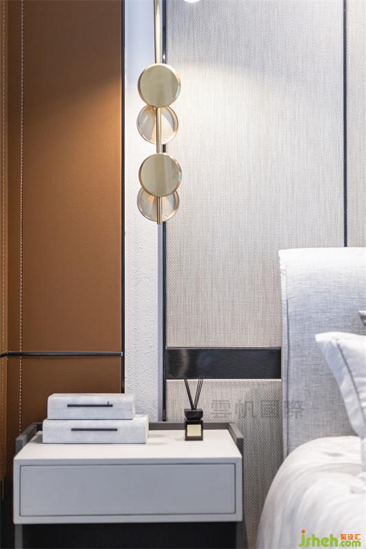 卧室用色雅致,木材与皮革和金属分格线构成床背景,有效提升卧室品质和温暖氛围。深浅有别、疏密有序的壁布硬包,则凸显细节质感。衣帽间半开放式收纳形式,更能体现衣帽间的展示性和实用功能。
