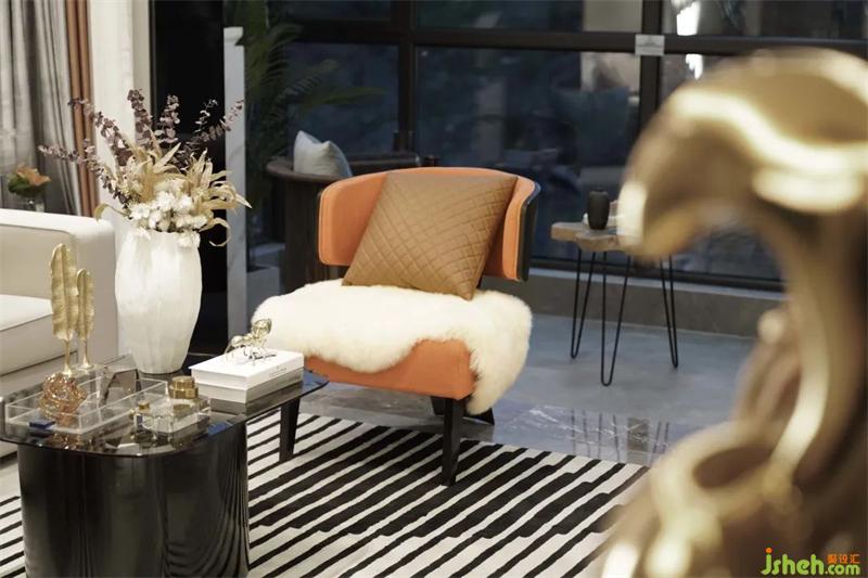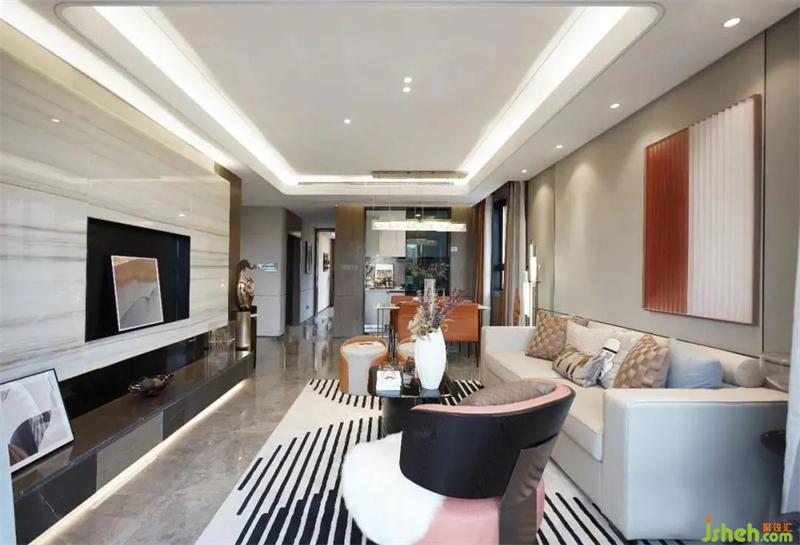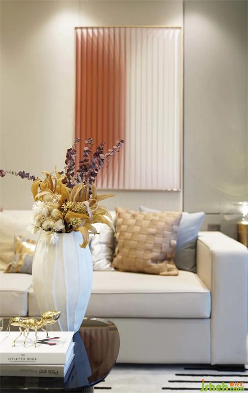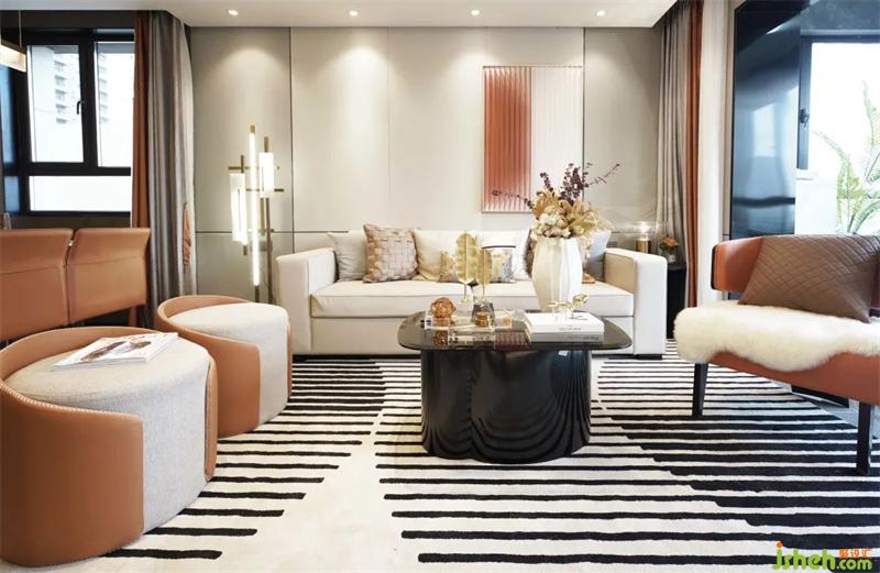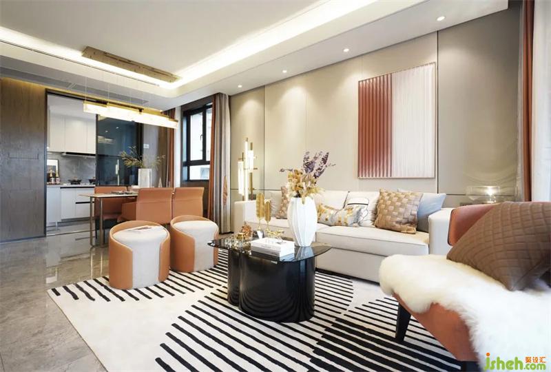 室样板间设计内没有一丝张扬及刻意,简单的色彩让人置身其中身心放松。细腻质地的白色沙发配以柔软的毛绒地毯,奠定了整体自然简单优雅的风格。