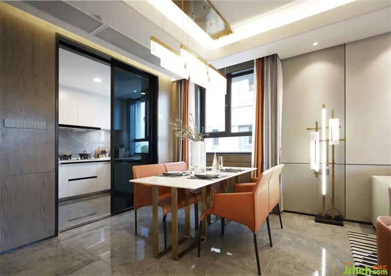 进入餐厅,运用最纯粹的线条来打造人们对用餐环境的感性需求。木质墙面配合柔和的橙色,令空间柔软而优雅。