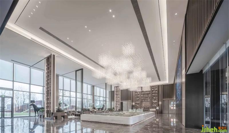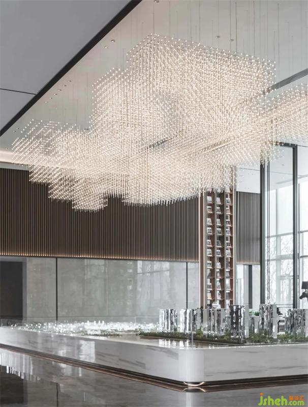 金属线条穿插、交叠,形成立体的网格状吊灯,将数学的理性严谨美具象化。远看云雾般的镂空设计将视觉引向更远方,呈现出“山色入城秋”的美感,也暗承西安古城的历史文化渊源。