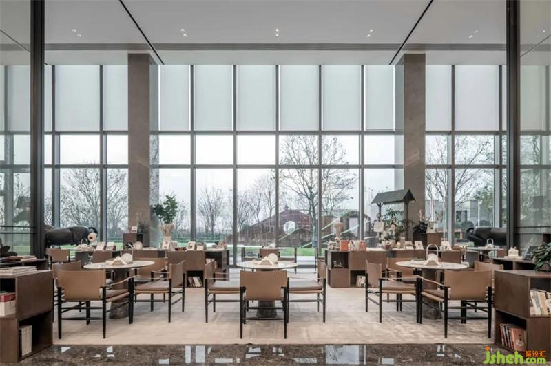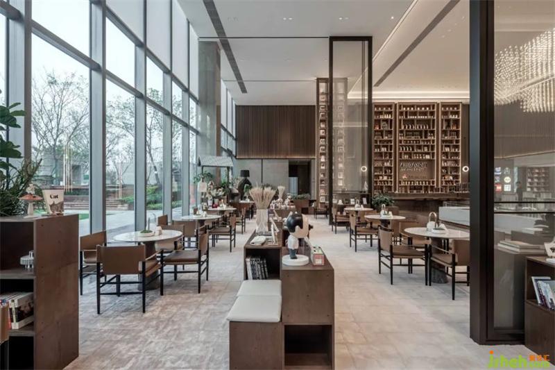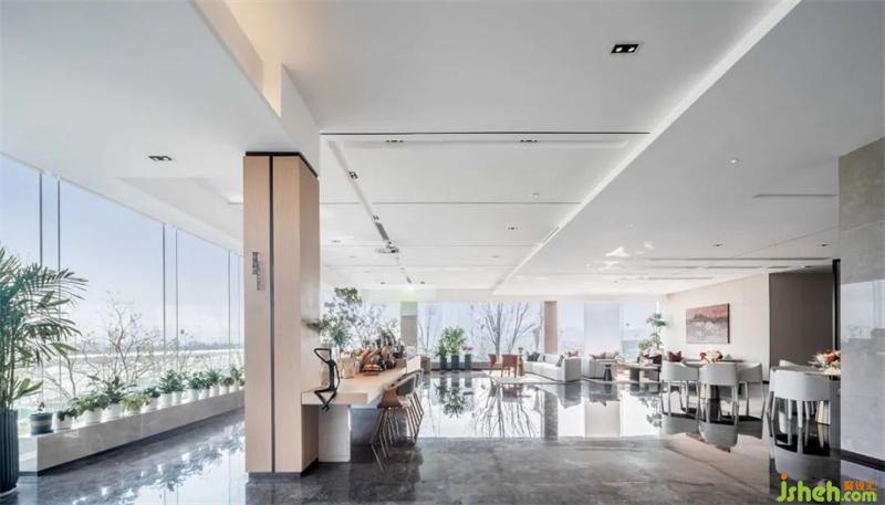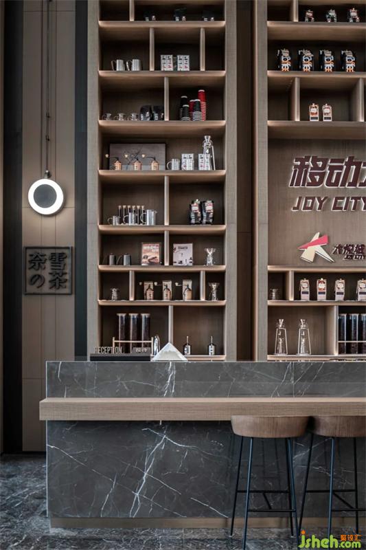 水吧区浑厚的木饰面板在墙面上纵横,简约的线条与面描摹出现代空间的艺术感。售楼处设计木饰面的温暖细腻与银河灰石材的冷静理性互相存托互相成就,整个空间秩序井然大气得体。