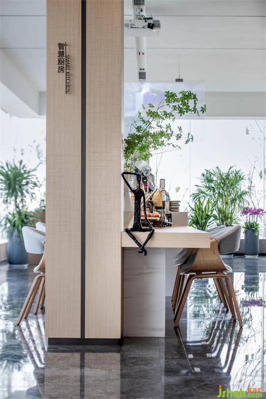 智慧厨房置于明亮之中,自然木色和黑色艺术品颇具雅趣。植物的加入,生气了整个空间,礼貌而不过分热络的与来访者产生舒服的联系。