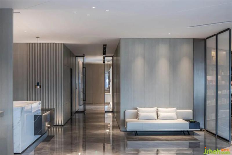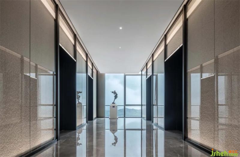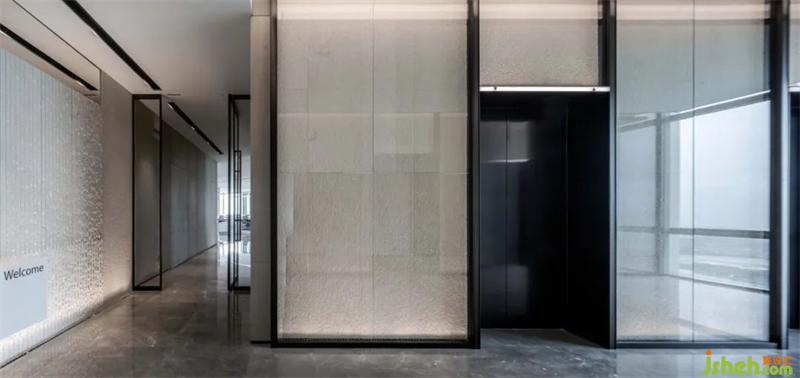 电梯厅作为空间的连接体,它在集合造型中充当空间元素的中介和摩擦。在材料的设计上,我们将细拉槽石材/玻璃进行碰撞,体现材料本身的张力,集合灯光的重要性去展现科技感的通道。