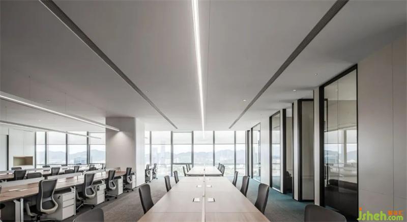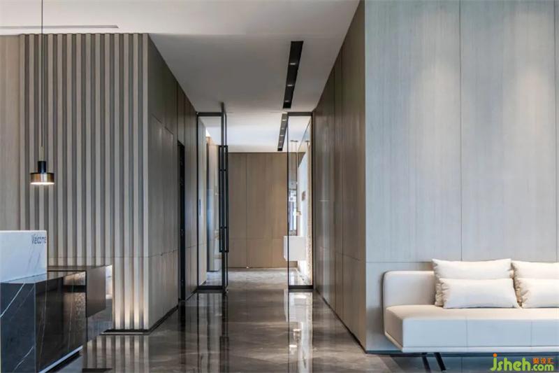 “五行之始,盛德在木”,空间中大量采用木质,办公总部设计并以栅格的形式,通过灯光、金属、石材的组合,成为衬托栅格的背景,光影的明暗与变化,在浅的墙面、深的地面之间,创造出一种飘动的状态,形成斑斓却又宁静的视觉效果。