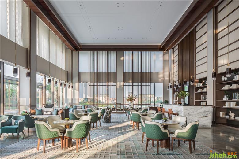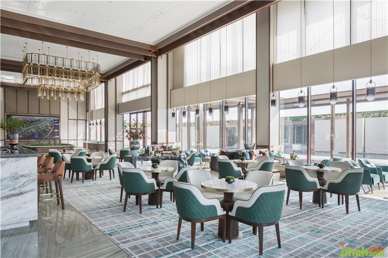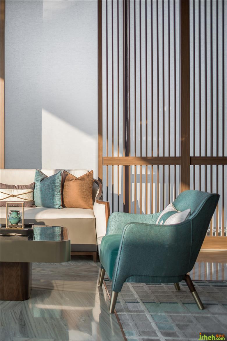 打破90°的正襟危坐,向后30°微仰的从容恣意。翠玉色包裹的单人座椅,仿铜不锈钢宽边的大理石茶几,颜色与材质隐喻着案名与城市典故。