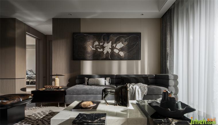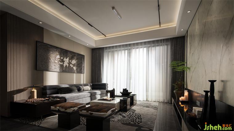 入室,客厅成为第一视角焦点,整个空间以东方风雅为设计基调,样板间设计师既思索当代艺术文化风向,也回味传统悠远东方雅,在传统与现代的交织碰撞下展开一场时间与空间的对话、叙事。样板房设计空间中光与影肆意穿梭游走于空间内外,通透而开放的空间格局将居住的舒适度填满,这是人与自然均可自由生长之地。