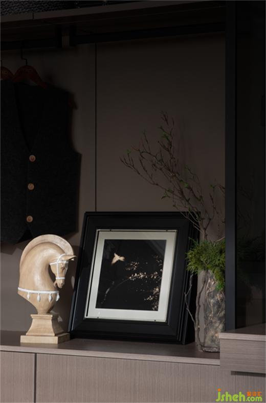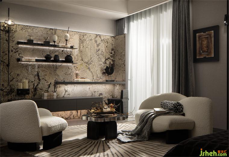 大理石背景墙以其自然独特的纹理衬托着空间的高雅格调,浓淡相宜的一支绿、一抹黄、抽象艺术挂画、淡雅瓷器等使得空间格调更圆满,仿佛这是东方文人雅士的惬意居所。在此空间,设计师以独特、松弛有度的手法使得空间在东方雅与现代的交融下,浓厚的艺术文化底蕴在此空间舒展、蔓延,这是一个精神与美学并驱的空间。