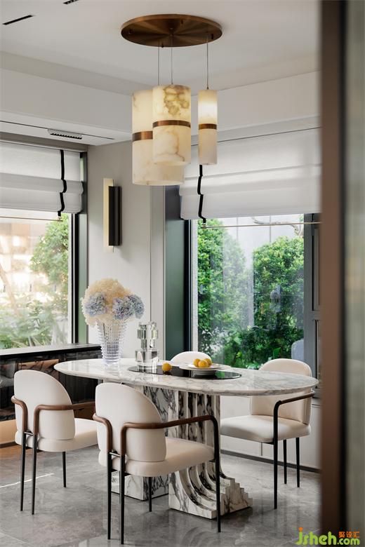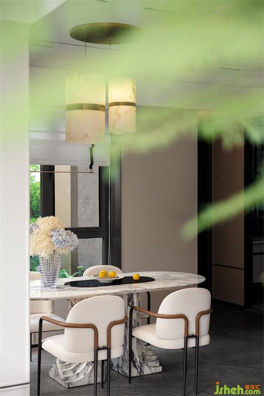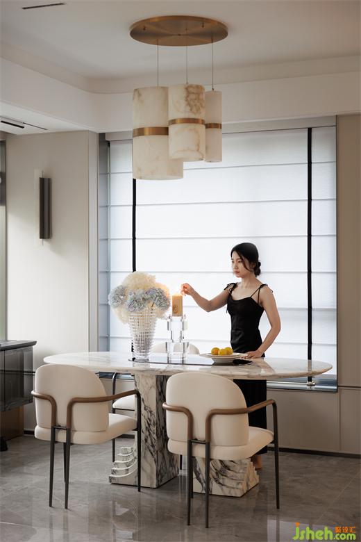 餐桌采用了斯卡帕的设计手法,层层叠叠的精细打磨,样板间设计几何形状与天然石材融为一体彰显家的细致品味,古典而极具现代感。