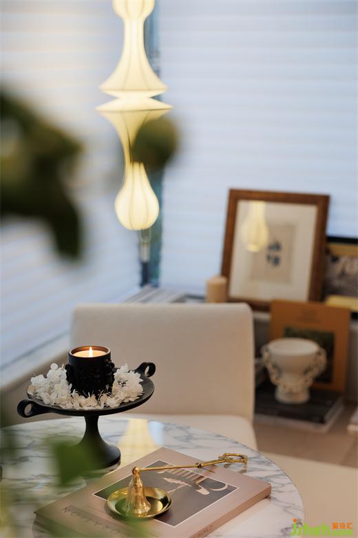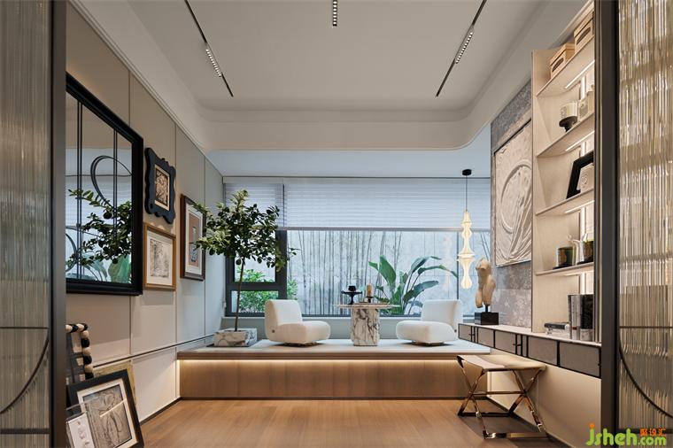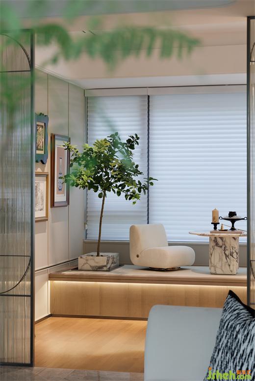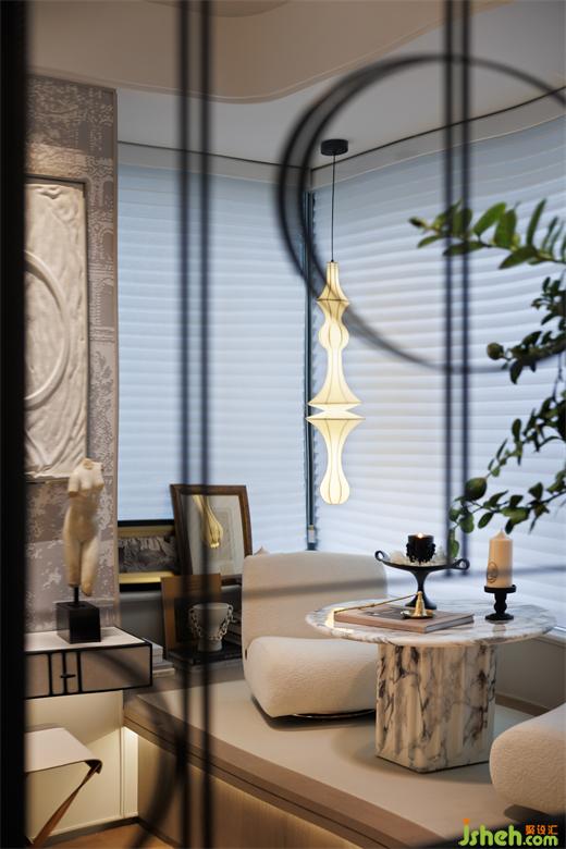 样板间设计利用飘窗台的层级设计,摆置小茶几和落地椅,这里可以是书房,也可以是二次起居室,还可以是爱好展览室,表达艺术世界里的内心色彩。