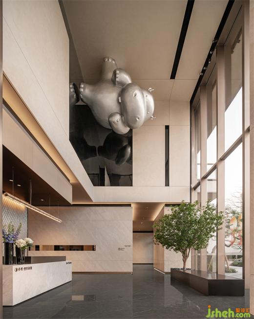 挥手打招呼的姿势吸引每位参观者的互动,在米色空间里更显亲近柔和。