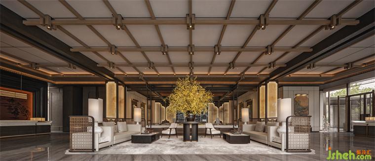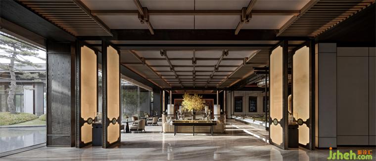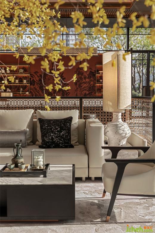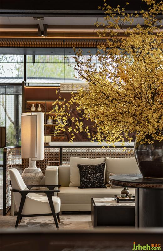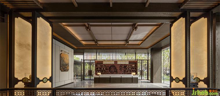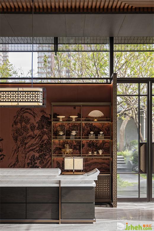 营销中心设计对称均衡的空间布局与古都中轴线交相辉映,黑木以翠绿如玉的石纹点缀,暖光映衬下,尽显温润文雅之风。