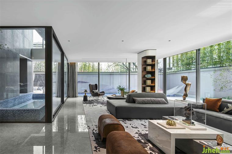 别墅样板房设计不需要范式,打破带来的趣味往往更深入人心。泳池不再是单一功能性的,而是成为了景观,延伸至室内,吊钟与蓝天倒映在水中,摇曳生姿,生活的趣味不就是在这不经意的美之中吗?