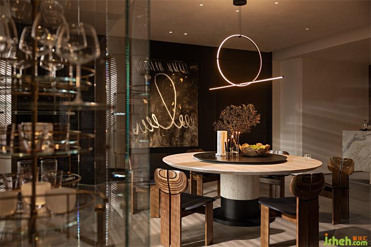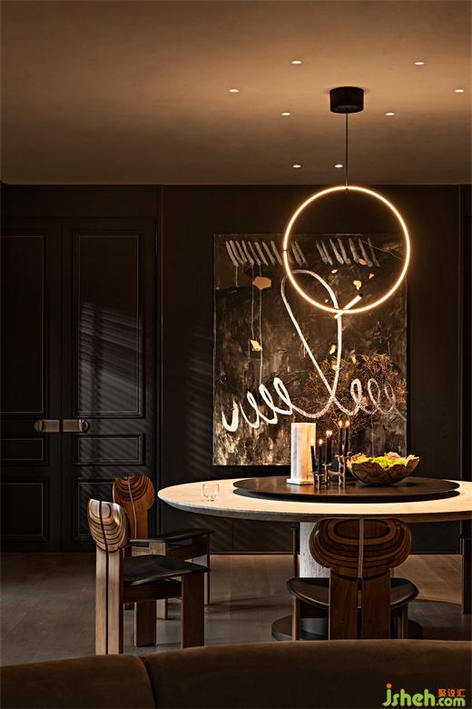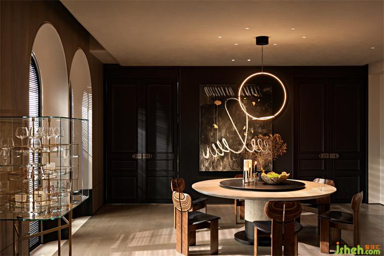 The sky is dark, the dusk of the night quietly sneaked into the room from the shutters, the light refracted on the glass side cabinet, diffused to the wall falling full of bright wall. Different from the rational restraint of the day, the romantic atmosphere after the evening is circulating in the air, the tangible boundary is gradually hidden, and the estrangement between people, between people and nature, and between people and the surrounding things is dissipated and harmony is born.
