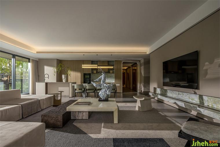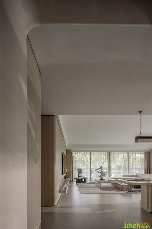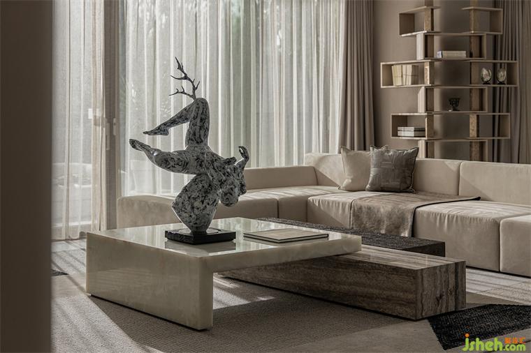 The furniture modeling of the space weakens the practicality and emphasizes the concept, so that the overall space temperament is not like the traditional space, but more a sense of abstraction. At this time, the placement of a figurative artwork breaks the sense of distance in space and adds a humanistic temperature.
