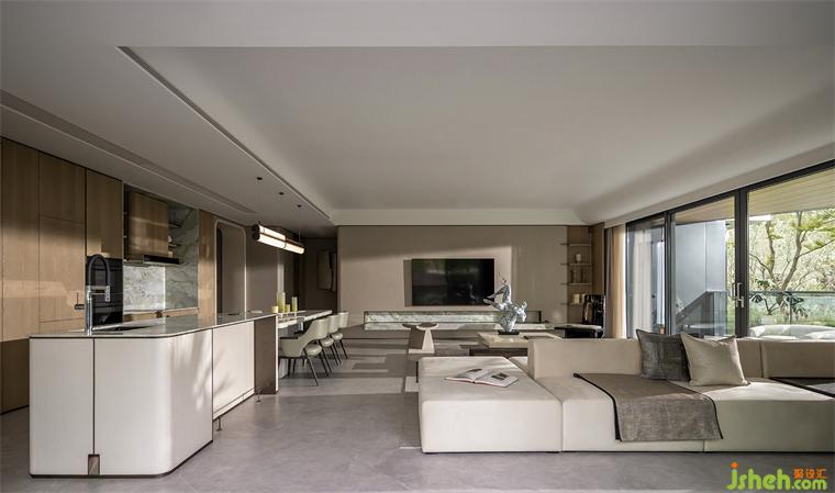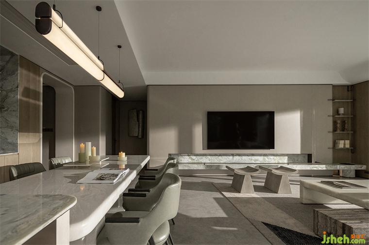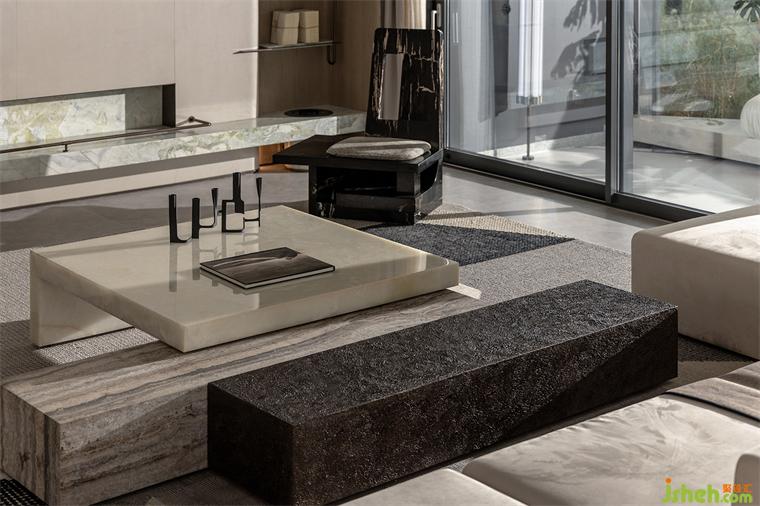 The space is crisp and concise, emphasizing the sense of mass and architecture. Seemingly casual design, but everywhere is ingenious, with different marble evolved into different parts of the space, the color and texture of the stone intertwined, in a beam of light, telling the story of the space, quiet, calm, rich power.