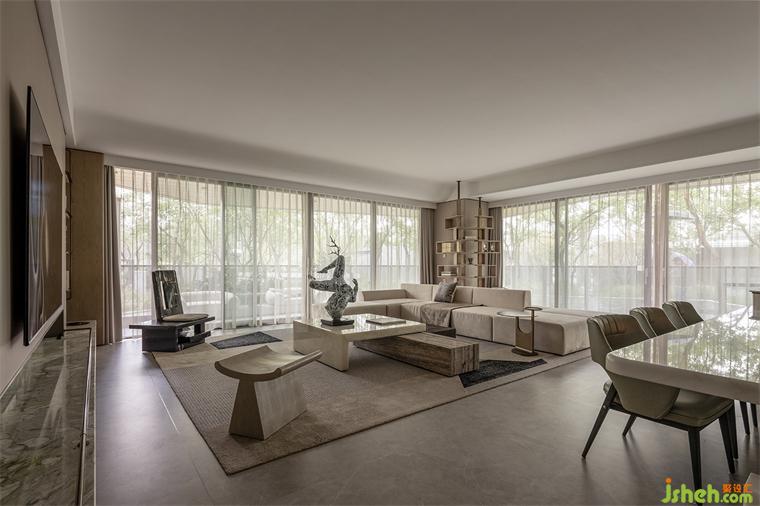空间的家具造型弱化了实用性,强调概念性,成都样板间设计让整体的空间气质不似传统空间,而是多了一份抽象感。而此时,一件具象艺术品的置入打破了空间的距离感,增添了一份人文的温度。