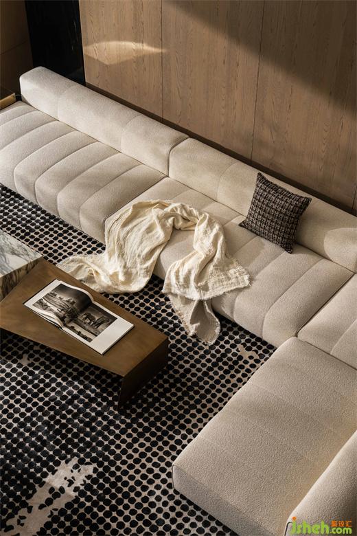 在简约的格局中,细节藏在不起眼的地方。块状的几何茶几、形如装饰柜的落地灯、虎纹提花天鹅绒的定制坐凳,每一个细节既低调又大胆。正是知道如何准确地将图形、色彩、斜线引入平静的空间里,赋予了空间宜居又散发风格和品质感的内核。