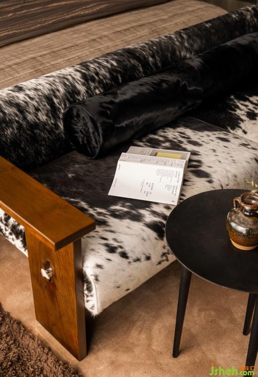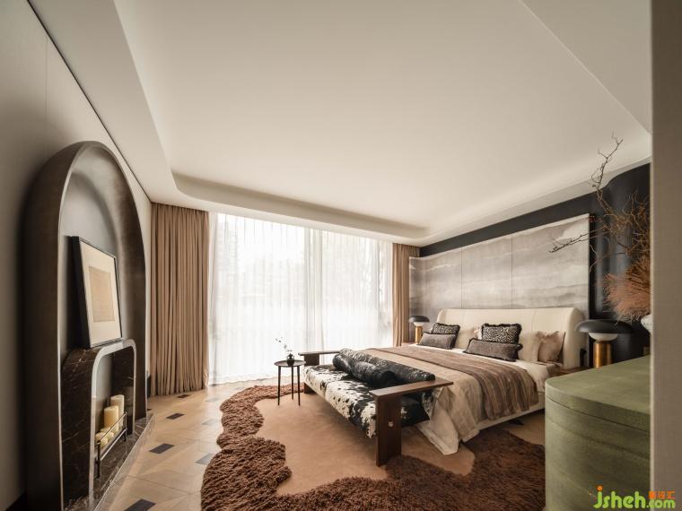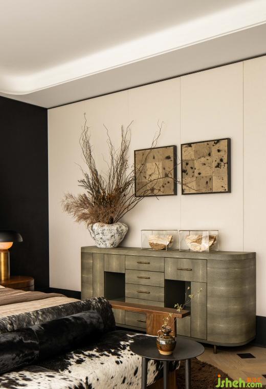 主卧在稳重大气之余兼具灵动自由感。雪花马毛的床尾沙发,珍珠鱼皮与金属结合的边柜,腐蚀铜质感的壁炉带来了奢华的触感,而壁炉上放置的男主人写给女主人的信及有机蔓延的地毯形态则赋予了不少浪漫气息。