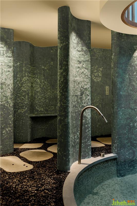 酒店设计泡池厅的磨砂玻璃竹筒灯具位于天窗下,当阳光洒落,竹子拔地而起向天生长,当天色暗沉,发出温暖的光继续生长,在空间中彰显顽强的生命力,与水的流动性一起增强空间活力。