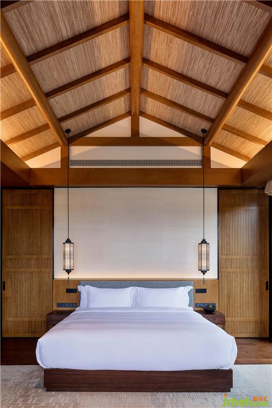 别墅客房风格简洁质朴,形如竹片的地毯,纹路细腻,深黄、浅黄、浅灰的颜色晕染,增加空间的写意感;床头的金属布罩吊灯与客厅的灯具形成系列,是结合中国古典窗格图形与纸糊灯笼外观演变而来,既经久耐用,又使整体空间的中式氛围更加浓郁。