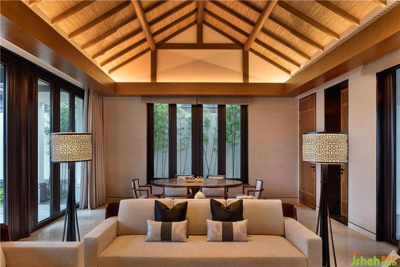 酒店设计客厅沙发区的深色木质家具延续空间的硬装色调,圆润的曲线与温润的触感尽显敦厚沉稳,搭配浅色系的布料,古朴而典雅。黑色丝绸抱枕采用中国画的描边手法,并以金色勾边,提亮空间,体现出悦榕庄低调的华贵气质,小腰枕上的竹叶暗纹呼应窗外竹景,营造诗意栖居氛围。