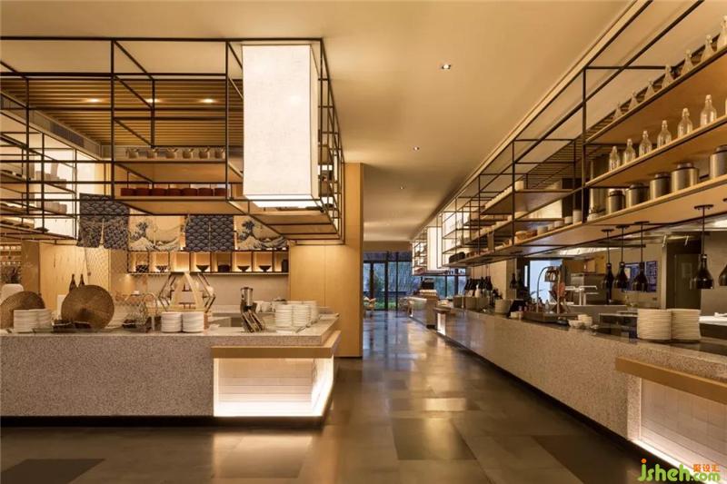 酒店大堂因土建较高,天花又为斜面,最高点接近13米,为解决超高的空间尺度感,YANG从中国传统建筑中获取灵感,用具有自然肌理的木纹铝板在天花构建区别于传统形式的木梁结构,增强空间建筑感,又尽显休闲度假风情。酒店设计