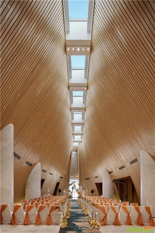 婚礼礼堂形如收起的渔网,寓意新人收获幸福,顶部与面海一侧墙引入自然光线,消除闭合空间带来的压抑感。触目可及的日月星辰与壮丽海景,让爱情的浪漫不只在传说里。