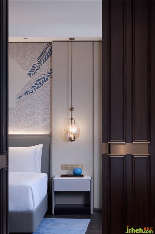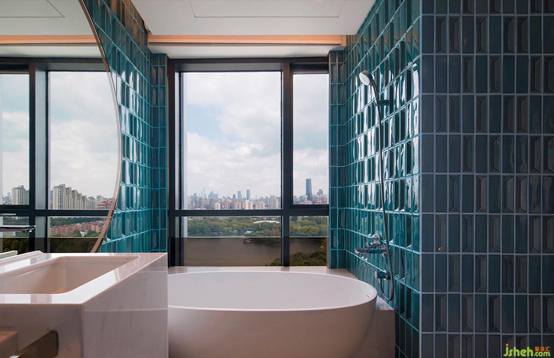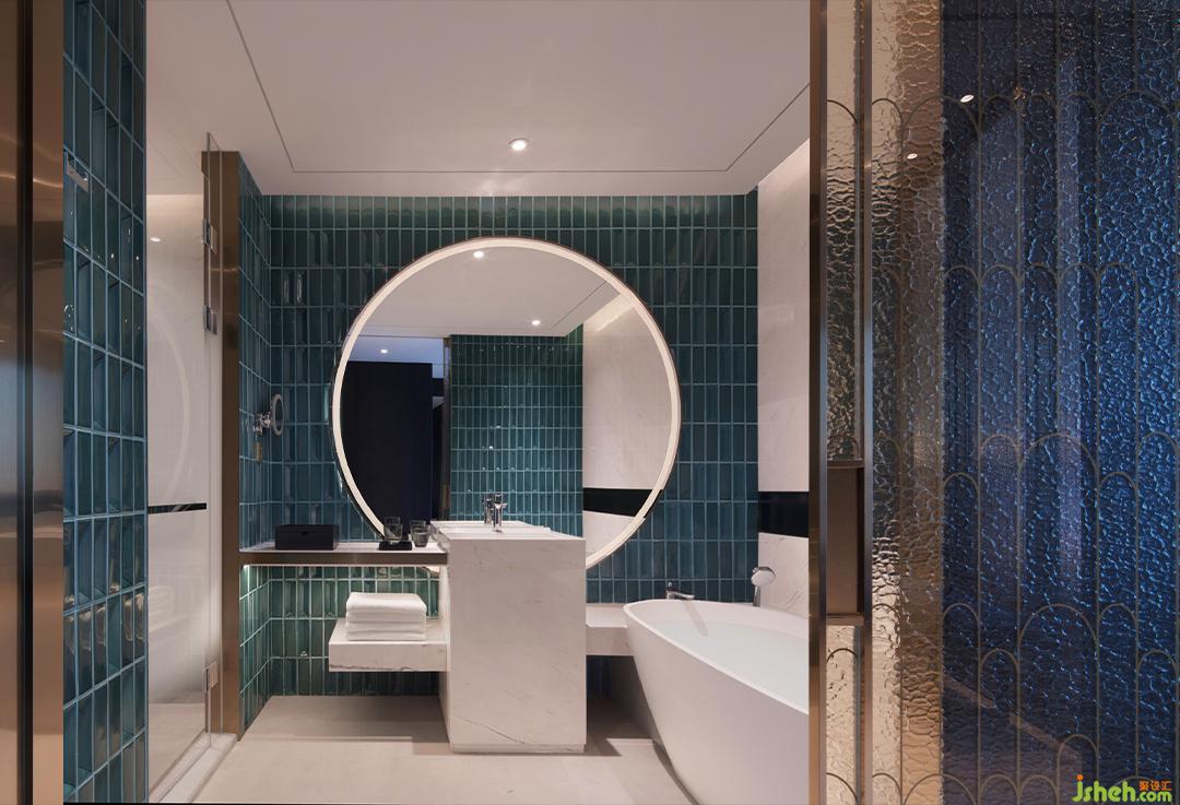 独具匠心的卫浴区,菱格陶砖墙次第铺展,新月镜悬浮正中,上海酒店设计搭配由古典家具演变的条案台,似湖漾山水翠,星月满银晖;又似春深庭院里,隔窗弄青梅,暗藏无限生动气韵。