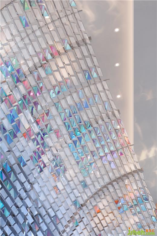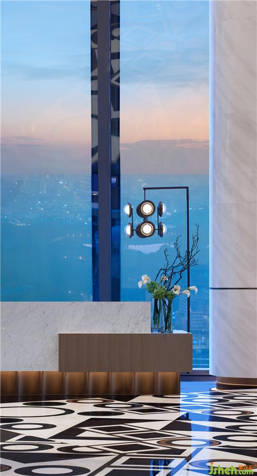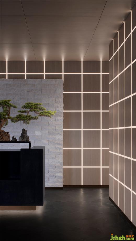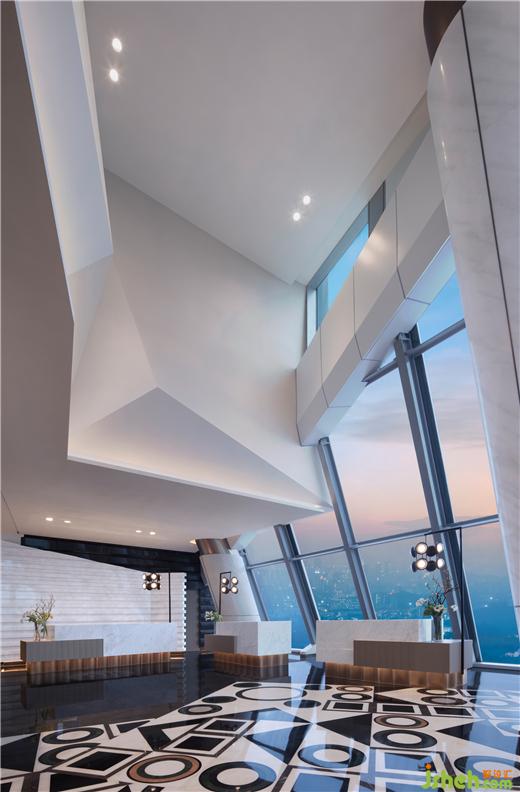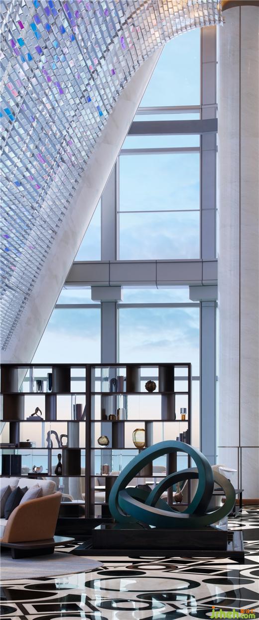穿越都市丛林,直达天幕大堂。均质雅白的立体折面天花,为14米极致层高的狭长空间引入丰富变化。线性墨色石材墙面从抵达厅延伸至大堂,如轨道坚定朝向远方。源自枕木灵感的艺术品悬浮一侧,跃动斑斓虹光。