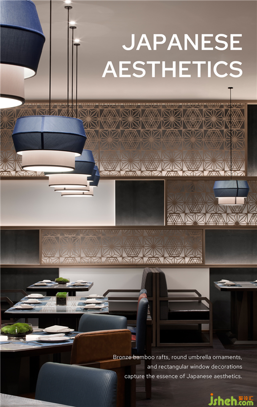 步入日式餐厅,竖向古铜竹排、圆形和风伞饰、面面矩形窗花,构建清冷克制的日式美学。标志性的神奈川冲浪图,丰富空间感官,唤醒江户时代的新鲜体验。