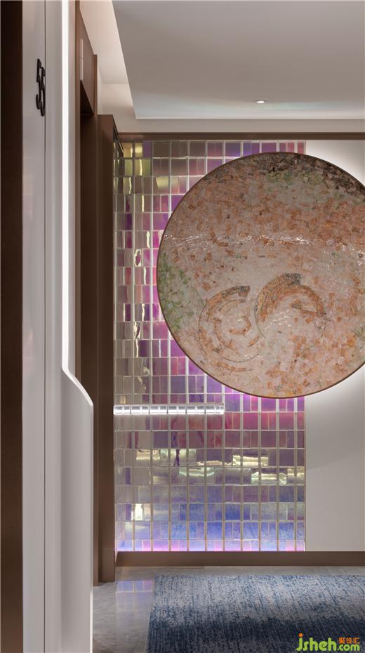 电梯厅香槟金与米白巧妙搭配,特别设计的拱形按键区,优雅弧度激发瞬间惊喜。炫彩玻璃艺术墙,悄然呼应大堂装饰。