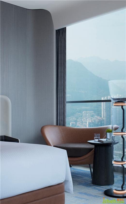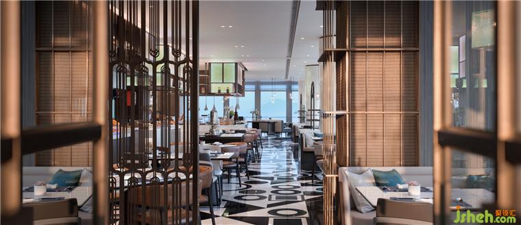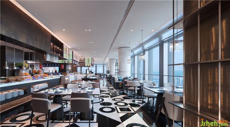 全日餐延续法式风情,墨绿、深灰、暖橙图案交错,与大堂共谱整体韵律感。深圳酒店设计细密线性格栅,创意序列灯具,营造强烈秩序感。270度奢华天际视野,启幕云端流动盛宴。