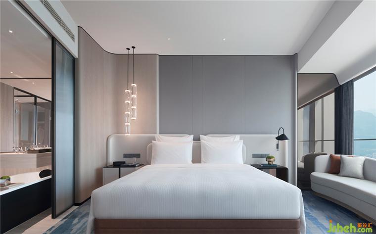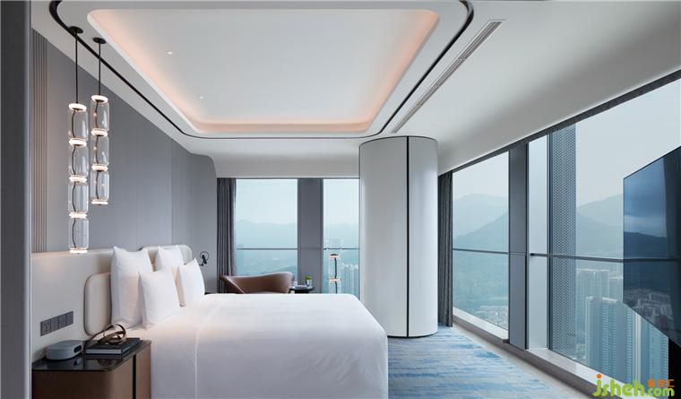 客房现代简约,弧形天花、清雅设色与有机线条的家具创造出温柔的包裹感,深圳酒店设计隐喻豪华车厢及铂尔曼的品牌起源,亦带来静谧温馨的感受。
