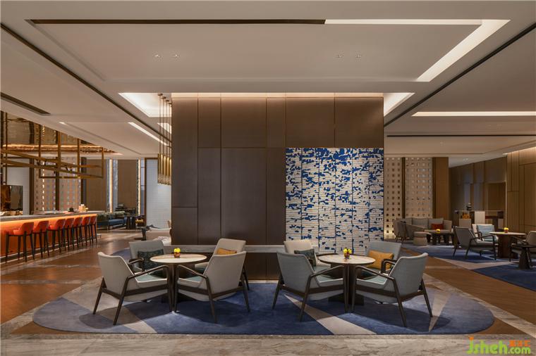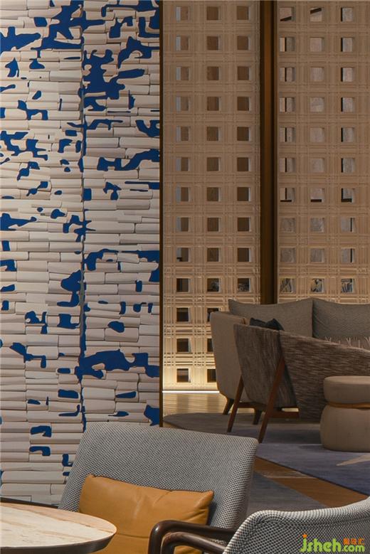 借松江四大布种之一的药斑纹布为灵感,取其晾挂飘逸之势,上海松江凯悦酒店设计让人一进入酒店大堂,就瞬时相逢昔日织造盛景。15米挑高空间,四面菱格陶砖拼贴的艺术装置如巨幅帘布从天花悬坠而下,奔涌着月白、水绿、钴蓝等色彩……