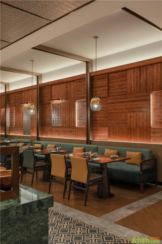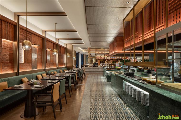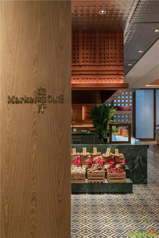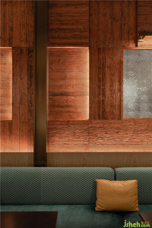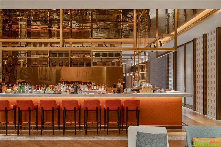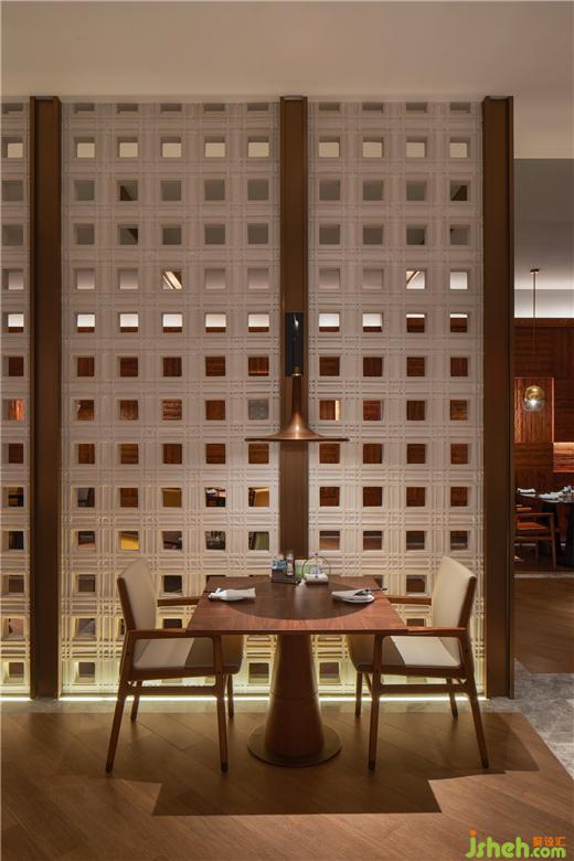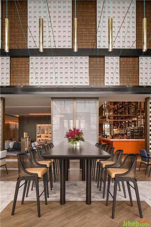开阔的休息区上,长线铜柱灯阵列悬空,如旧日纺线密织机纾。古老织布机,被提炼出干净利落的直线语言,按比例分割装饰。间或大片胡桃木的深棕、镂空肌理的荼白,缓解强烈秩序线条带来的紧张,使空间同时兼具优雅及舒适。