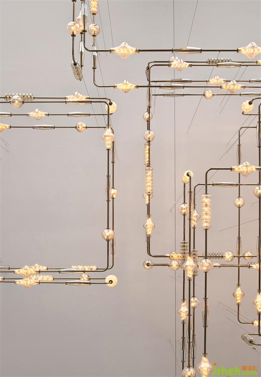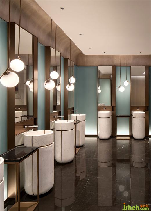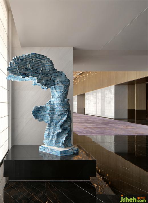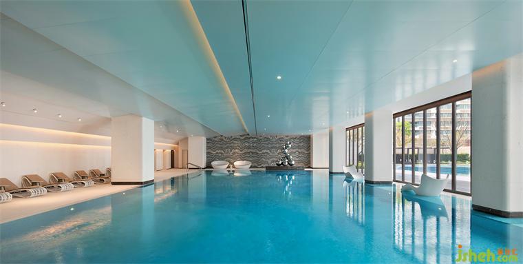 泳池的无边际设计和蓝色水面让人仿若置身大海。端头一座以水气泡为设计原型的现代雕塑,金属镜面球体大小不一的叠加错落,希尔顿酒店设计映射出墻面深色大理石的「波浪纹」,同时与波光潋滟的水面形成动静相宜,让空间更显活力。