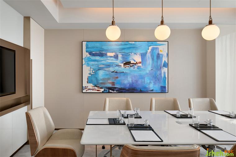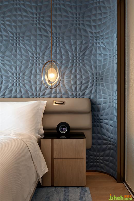 希尔顿酒店设计套房以静谧蓝为主色,辅以优雅的米灰色,营造安宁舒适的体验感。蓝色墻面&桌台和极简灯具的创意组合灵感源于「蓝色海面的星光熠熠」。