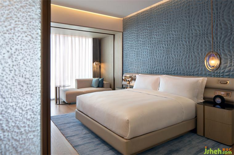 坐拥粤港澳大湾区优越的地理位置,酒店的每个房间都可观海景或国际会展中心的恢弘盛况,客房区硬装延续公区的海浪、帆船等设计元素,使整体元素连贯统一,实现内外一体、自然而生,连接世界、绽放湾区。