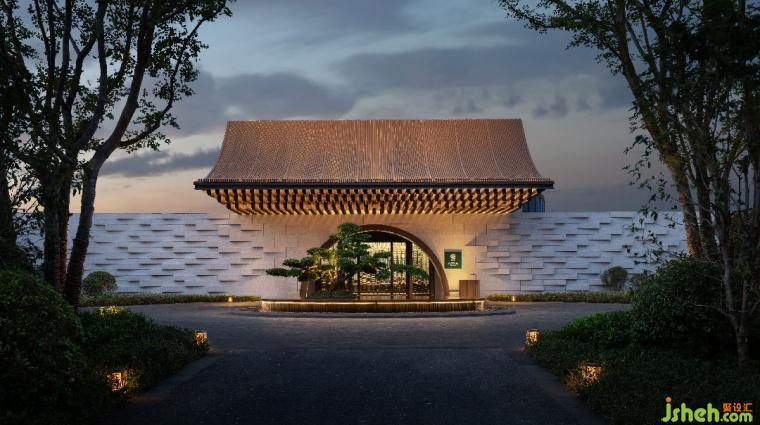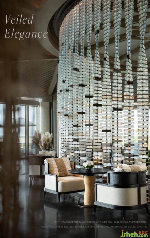 落客处水景与门洞互为映衬,写意江南园林的经典月亮门。大堂抬高使其悬浮湖面,邀人临风凭虚,揽湖天一色。中心下沉式大堂吧,创造视觉焦点并巧妙融合空间,层层递进丰富感官。