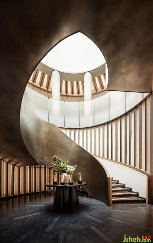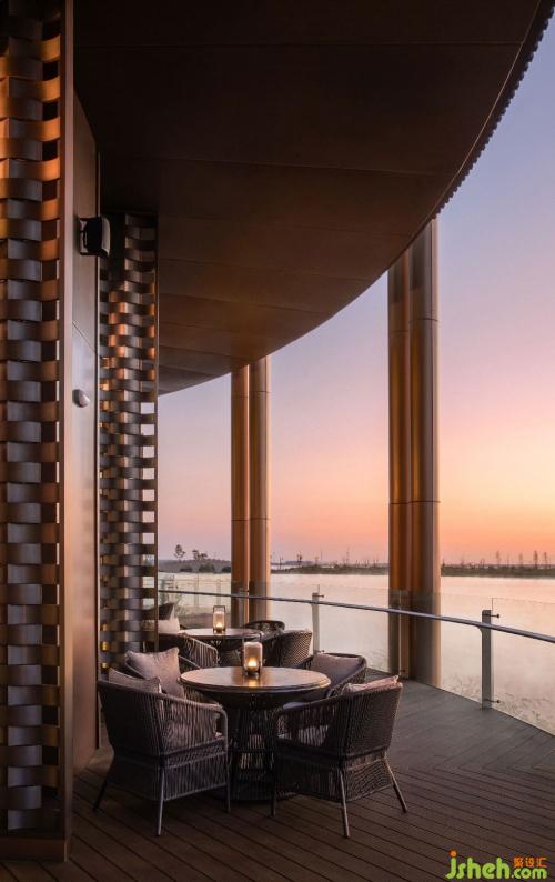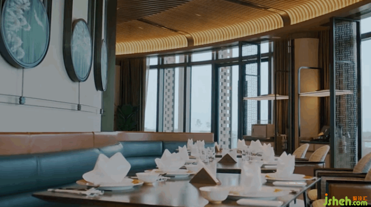 越过水景小园,步入全日餐。疏朗开阔的空间里,线与面交织出美的韵律。竖条御窑金砖或有序嵌入墙面,或穿插翡翠纹理接待台。太平船模解构再译,褐铁色碎片攒动点点渔火凌空,恍然踏入水巷枫桥。